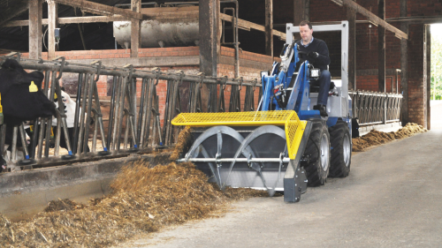 This feed processor is used to loosen and recondition pushed-aside and clumped-up feed on the feed table, and to return it to the animals. It makes work at the feed table easier in a single pass.